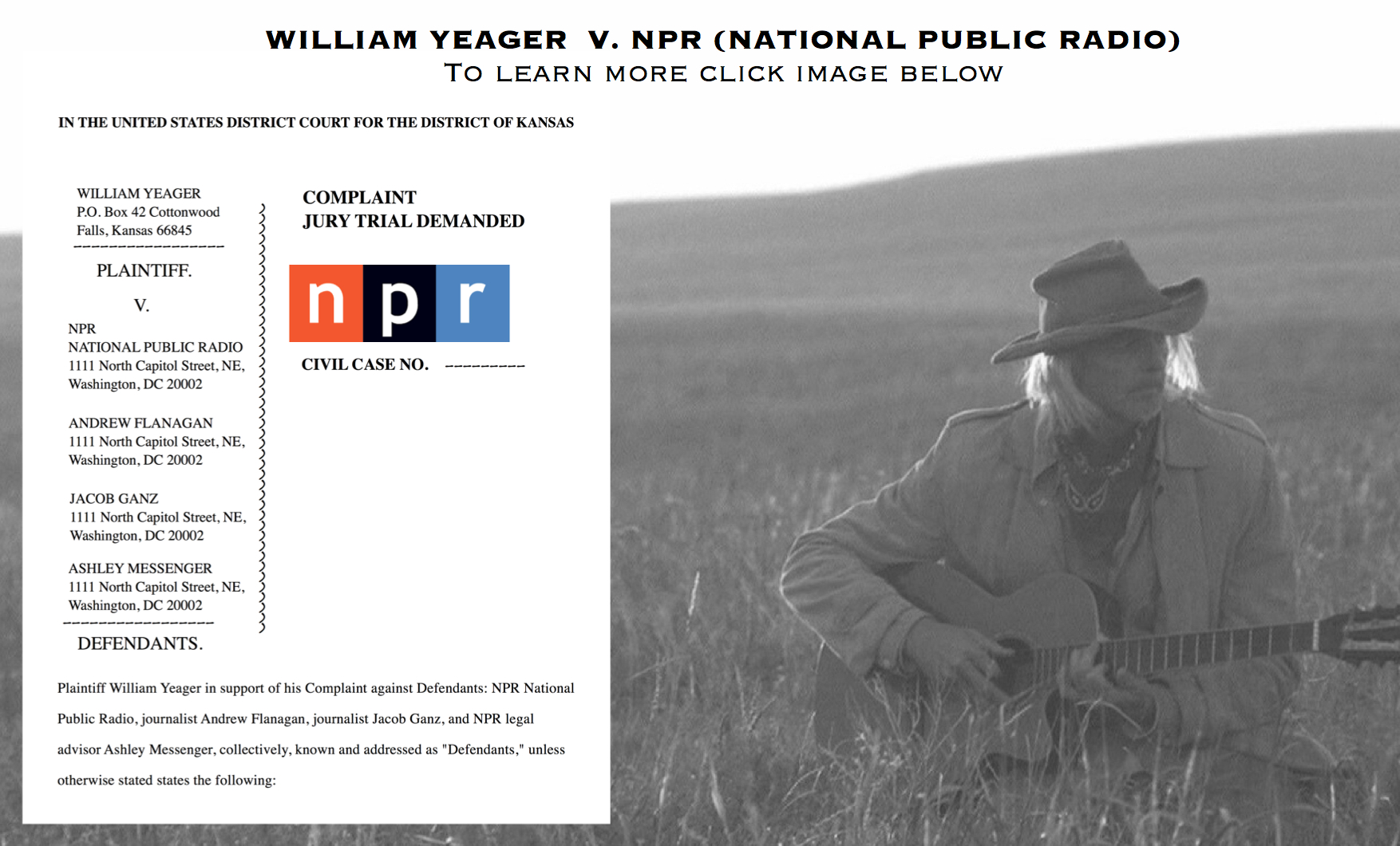 William Yeager NPR Lawsuit 2018 Published March 8, 2018 at 1754 × 1061 in Billy Yeager – Wake Up People (Music Video) ← Previous